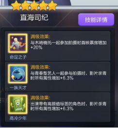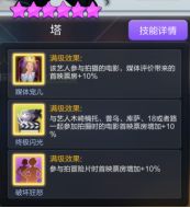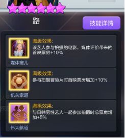 到后期主要上阵艺人是围绕着龙珠六星三人组做上阵搭配,三人组的满级技能配合起来能有“70%首映加成+10%总票加成”,加成是非常优秀的,不输于别的体系阵容核心。但是有可能出现剧本上阵限制的情况,所以尽可能还是把龙珠套的五星艺人或者海贼套五星艺人也凑一些,尽量让技能联动可以吃满。龙珠套艺人通过星影争辉获取,在获取之后最好是把这几位六星艺人的专属剧本都购买了,这是目前冒险体系剧本主要的来源。