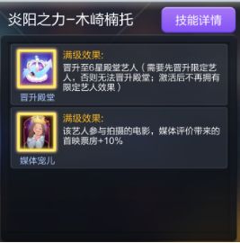 艺人“那叱”和艺人“敖冰”是中国艺人,冒险剧本可以刷出神鬼题材,固定刷新神鬼题材的剧本可以让“那叱”吃满30%首映+5%总票。冒险片大部分会带英雄题材,“敖冰”可以吃满30%首映加成,并且“那叱”本身还可以增加冒险名录,两名艺人吃满可以有“60%首映+5%总票”的加成,这两名艺人也是通过星影争辉活动获取。