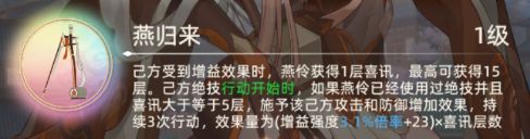 燕伶专属天赋:战斗开始时获得3层喜讯,天赋升至3级(不包括3级)以上时,喜讯最大层数随天赋等级提升增加。