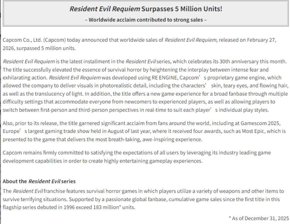 卡普空今日正式官宣,2026年2月27日发售的《生化危机:安魂曲》全球销量已达500万份,发售仅5天便达成这一里程碑,成为系列销售速度最快的作品之一。