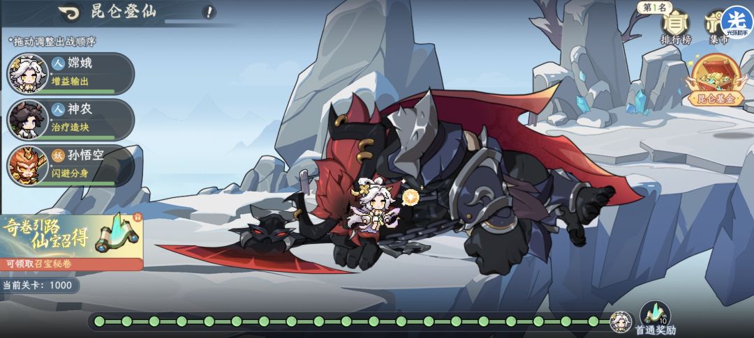 昆仑:阵容:嫦娥,猴子,蜘蛛,战力低蜘蛛换神农 800-900层:战力高的横推,战力低的注意下有巢跟天鹿