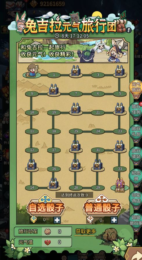 1、活动期间,可以通过完成任务或购买礼包等途径获得旅行骰子,使用骰子可以在活动地图上与兔吉拉一起旅行