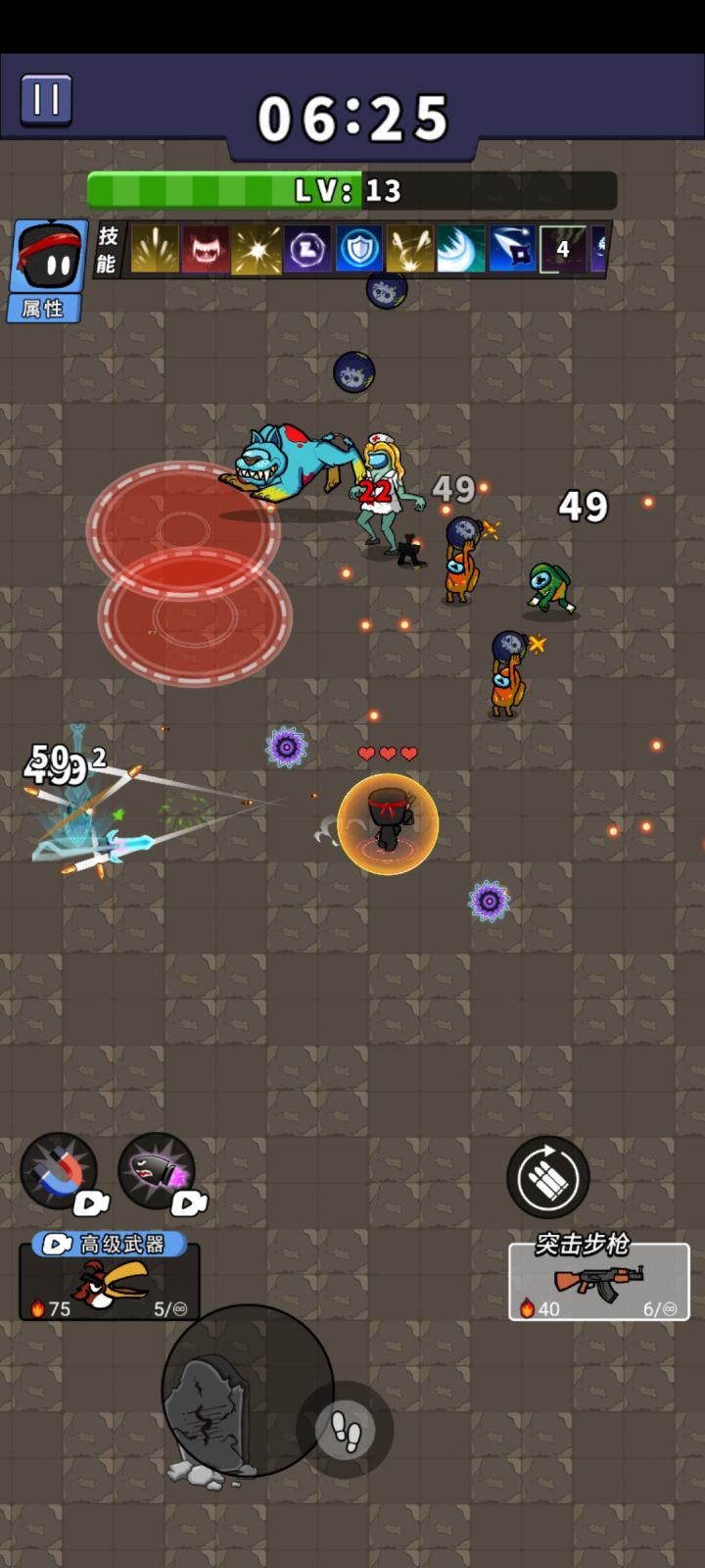 2D平面肉鸽射击游戏,和黎明前二十分钟有点像,没做操作介绍,单手指控制摇杆移动走位即可,上手门槛很低。