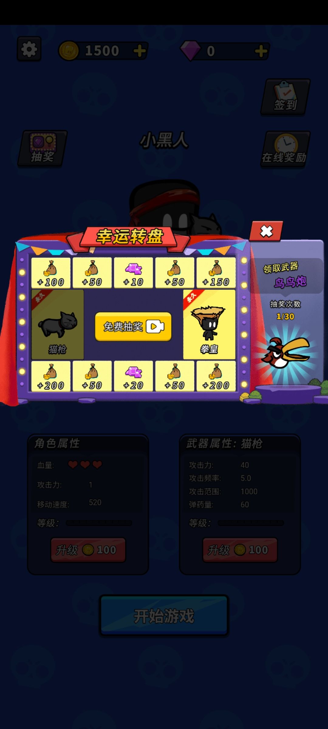 2D卡通画风,界面结构常规,UI品质同小游戏水准,有一定动态效果。角色造型是小黑人,各种头部造型是最大差别,武器种类很丰富,包括一般理解的枪械,以及喵喵枪、喔喔鸡这种奇葩武器。射击打击感还可以,操作手感较好,战斗有割草游戏的快感,也有一定观赏性。