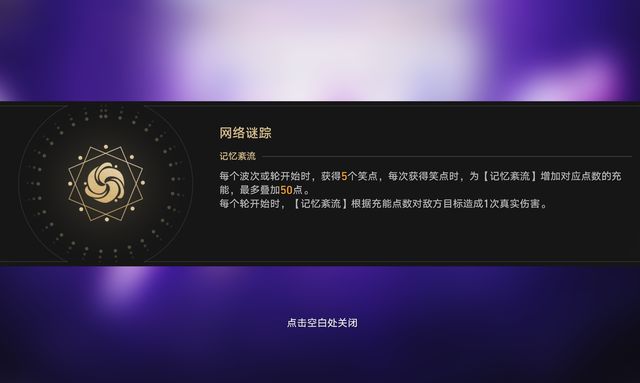 每个回合或者轮开始时,会获得5个笑点,并且获得笑点也可以为记忆紊流叠层,最多50层,每个轮次开始时,会根据获得的笑点对敌方造成一次高额伤害。