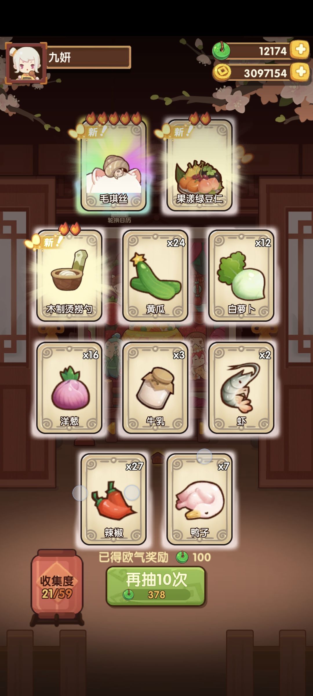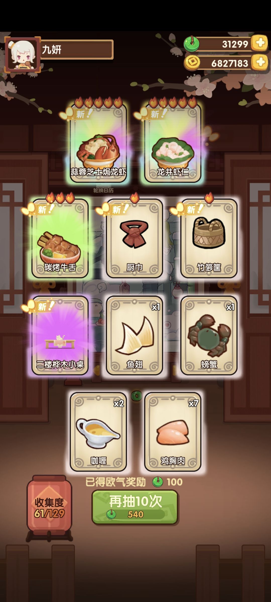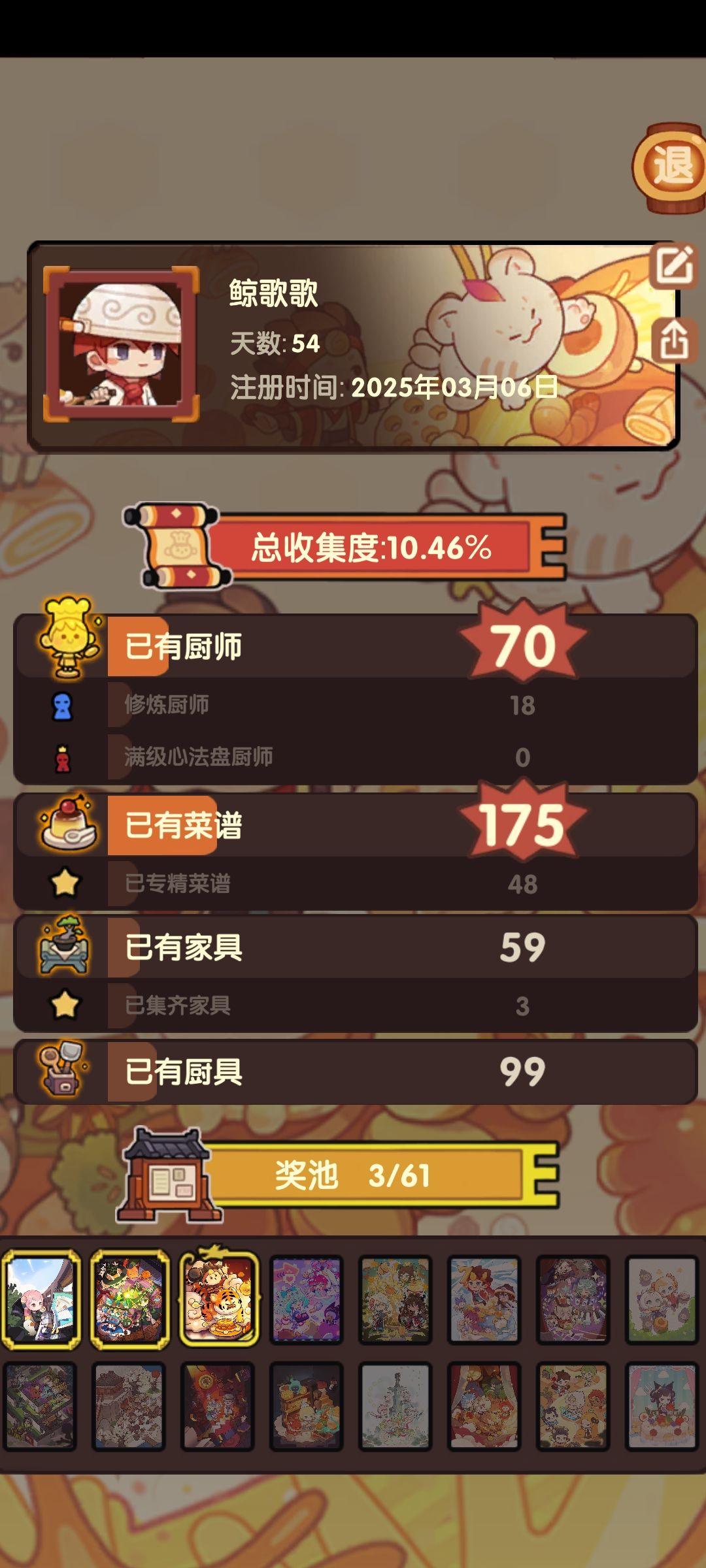 璧池46厨师89装饰103菜谱还差6个厨具,等我以后有玉再抽吧~猫咪天堂出了沉了一道菜,还好只花了7k玉