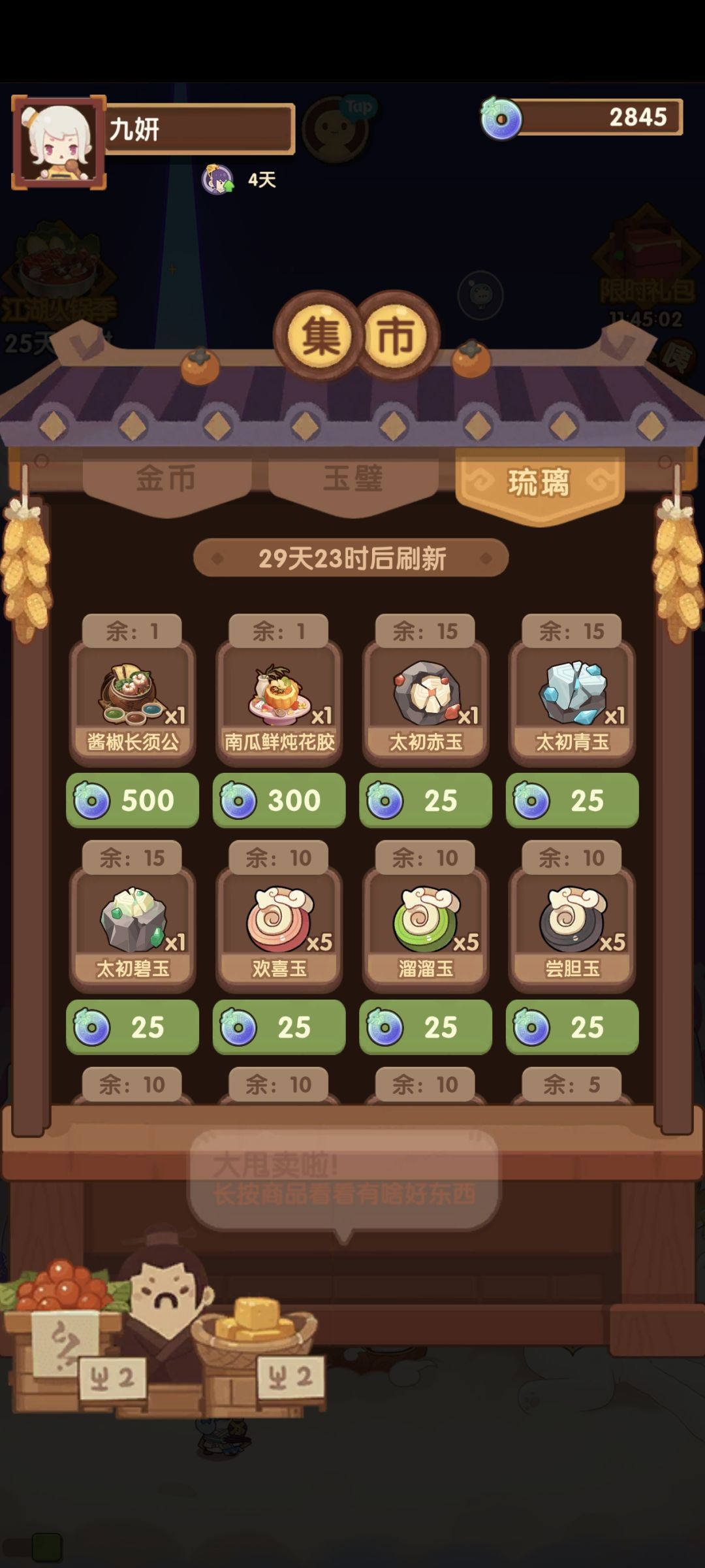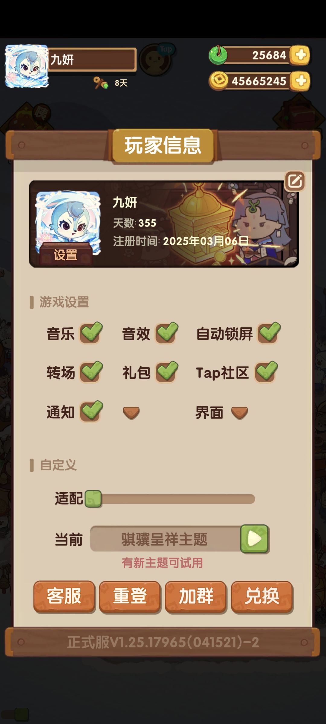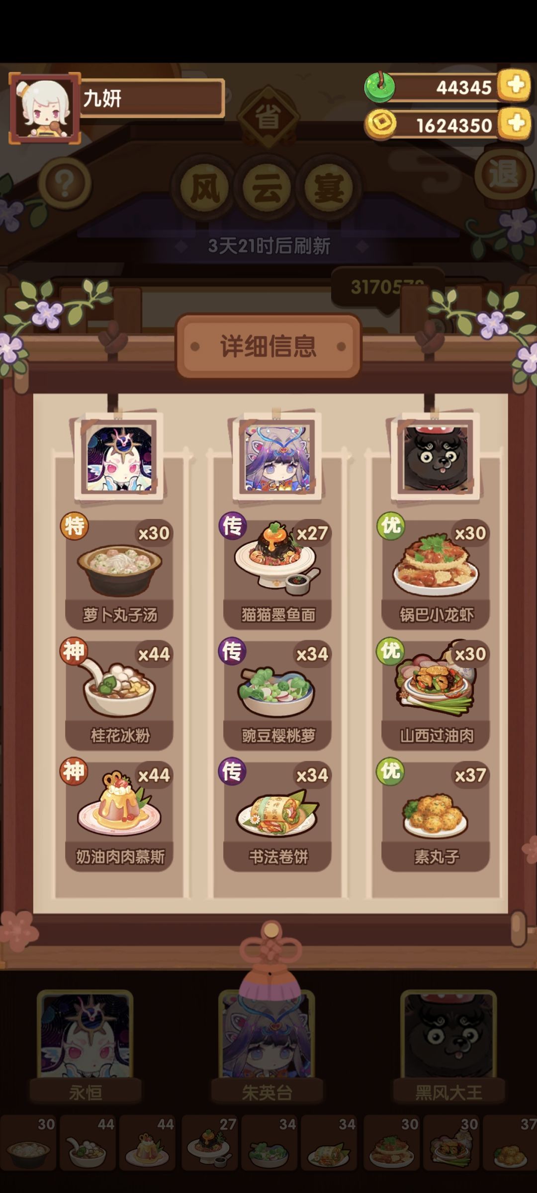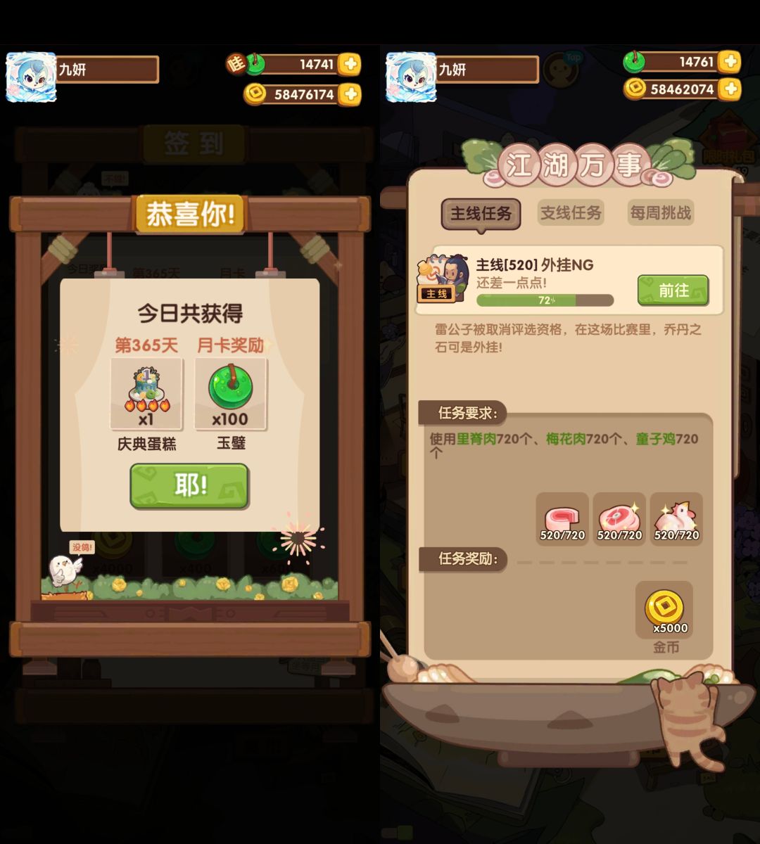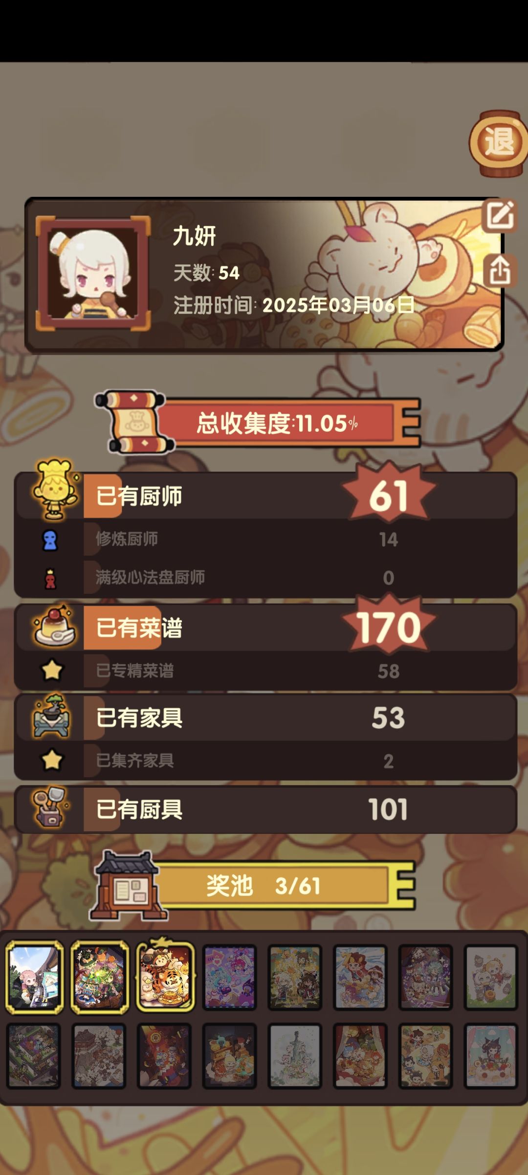 25年3月6号开始玩~第1天就玩几分钟,第2天开始做主线第4天解锁厨神大赛、风云宴第7天推到主线89,第12天解锁鱼塘开始推限时任务思乡之情➕喵食城,用了7天时间推限时,没有咋推主线第20天...