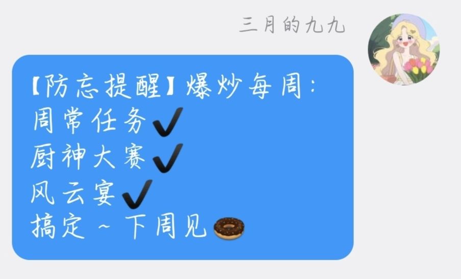 想起来有次我可能周常落下了,我就开启了爆炒群聊每周日提醒⬇️不知道有没有帮助到你们呢~还是觉得烦我每周日都出现这个小提醒![[表情_微笑]](https://img-tc.tapimg.com/market/images/0f170d4b1ecf80c267e5a44b5992a199.png)