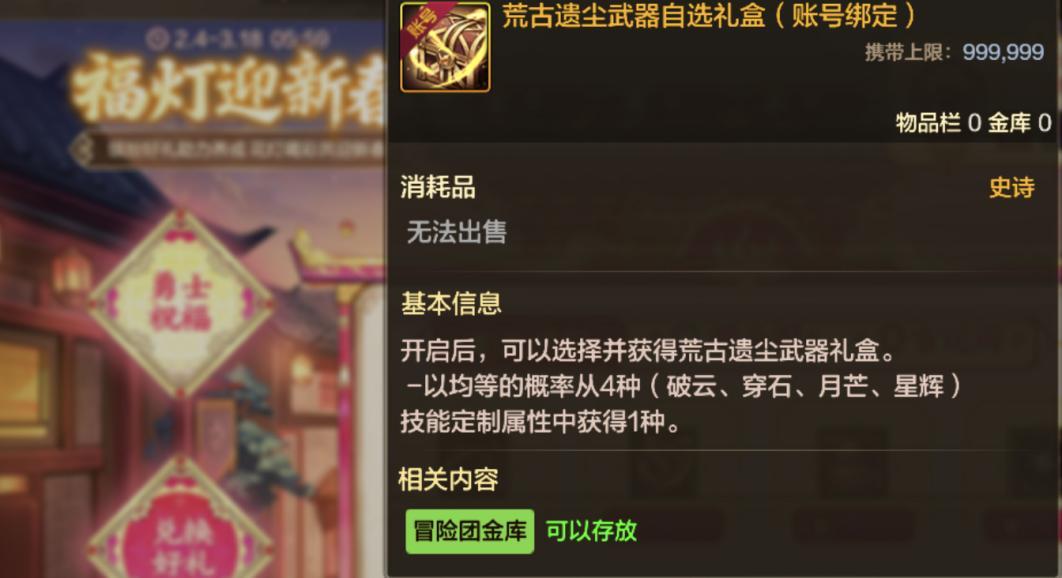 兄弟们、福灯迎新春活动,送出“1个荒古武器自选礼盒”、为了避免兄弟们选错、特别分享〔全职业荒古武器推荐〕!