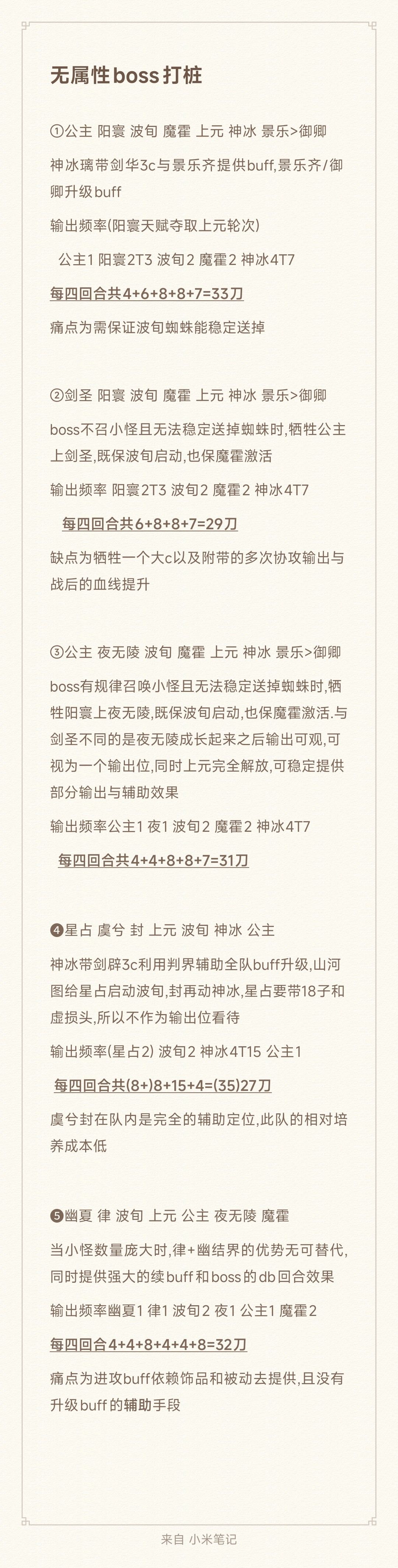 因boss机制不同,以及每队角色、buff数量以及质量不尽相同,出刀力度不能一概而论,故只做大致分析