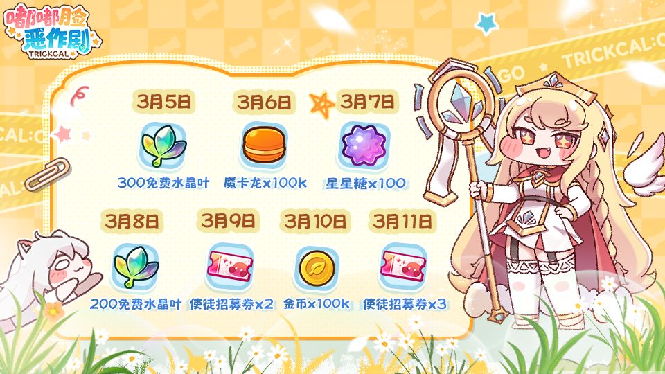 分别发放:「免费水晶叶*300」「魔卡龙*100000」「星星糖*100」「免费水晶叶*200」「使徒招募券*2」「金币*100000」「使徒招募券*3」