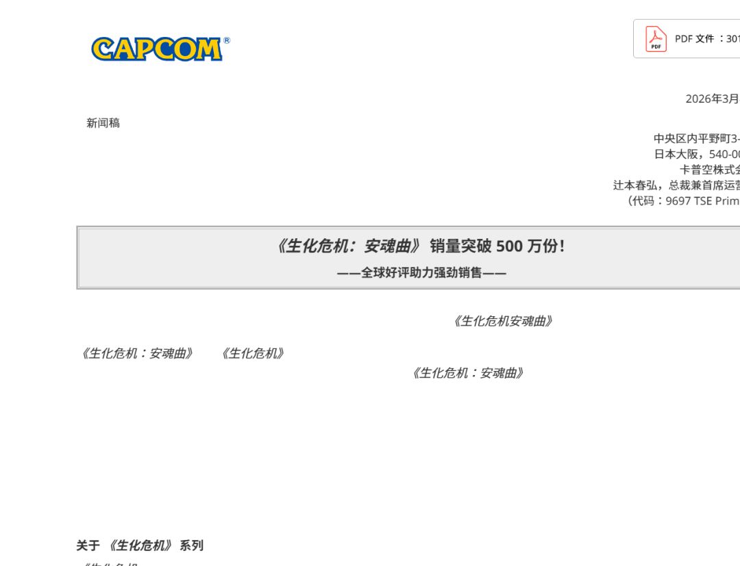 卡普空(Capcom)官方正式宣布,旗下生存恐怖大作《生化危机 9:安魂曲》(Resident Evil Requiem)在 2月27日 全球同步发售后的短短五天内,累计销量已正式突破 500 万份。
