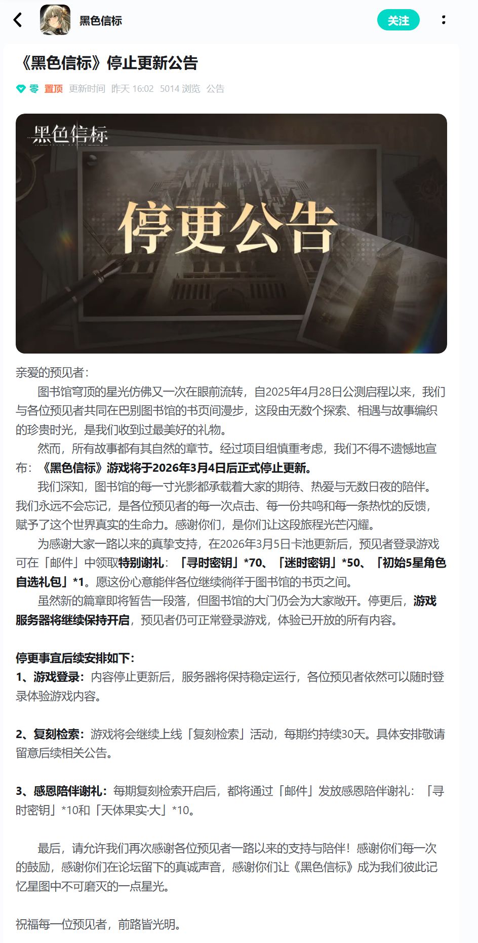 根据项目组发布的《停止更新公告》,虽然游戏不再推出新的剧情与角色,但服务器将继续保持稳定运行,玩家依然可以正常登录并体验已开放的所有内容。为了回馈玩家,官方在 3 月 5 日发放了包含“5星角色自选礼包”及大量抽卡资源的特别谢礼。后续游戏将转为循环开启“复刻检索”活动,并定期发放感恩补偿。