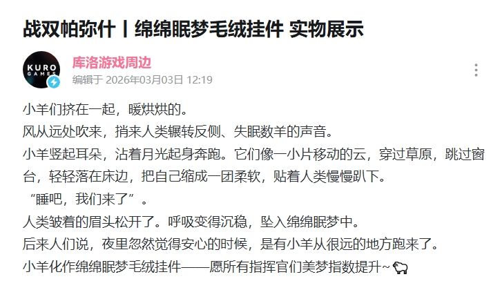 有限公司研发的末世科幻题材的3D动作手游《战双帕弥什》(后文简称战双),近日爆料了战双帕弥什新周边的实物图,就是丽芙相关周边,那个绵绵眠梦毛绒挂件。