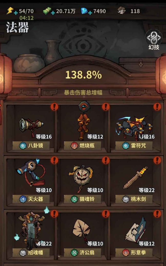 招魂幡(小鬼):巨实用的辅助法器,尤其是电系,雷和八卦镜这种冷却久的,小鬼能很好地补充伤害,保命效果直接拉满。打远程怪的时候,小鬼能当护盾用;打 BOSS 的时候,能有效牵制,而且怪攻击小鬼的时候,对玩家是没有碰撞伤害的,手法好的兄弟,能利用这点穿怪,或者跟怪重叠打环绕枪。不建议主养小鬼,一是它没法攻击空中目标,二是想要高伤害,要堆不少词条,前期不容易成型。辅助用的话,有点生命、个数、冷却的词条就够用,不怎么吃鬼火,开荒期性价比极高。
