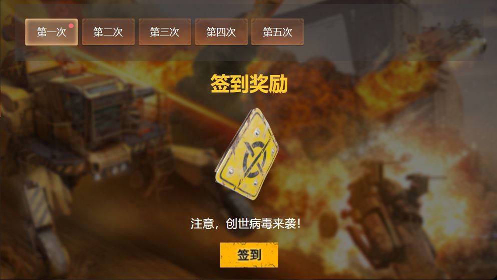 第二重活动“签到有礼”活动时间:3月6日至 3月12日签到奖励:第一次 标识牌:注意,创世病毒来袭!第二次 全息投影仪:常青树第三次 高账:高级账号3天第四次 补给箱:驾驶员贮藏点第五次 补给箱:史诗级箱子