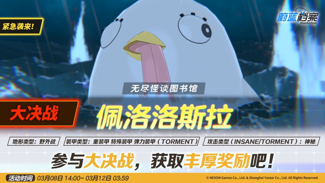 *大决战说明:佩洛洛斯拉(弹力装甲)将开放NORMAL~TORMENT难度,其余两种防御类型的首领将仅开放至INSANE难度。