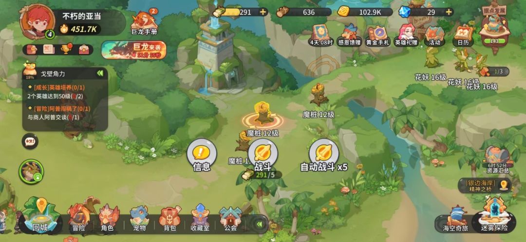 既然是冒险放置手游,那一定会有大家熟悉的爬塔啦,在失落之塔里,每通过一关,我们都会获得技能精魄,金币,强化魔晶等一系列用于角色提升的奖励,除此之外,我们每多通过一关,挂机奖励都会随之提升,因此只要条件允许,失落之塔一定是必打的内容。每通过五关,我们还可以在左边的宝箱中拿到额外的丰厚奖励。不过一般关底的boss实力会比较强大,需要谨慎调整队伍后继续。