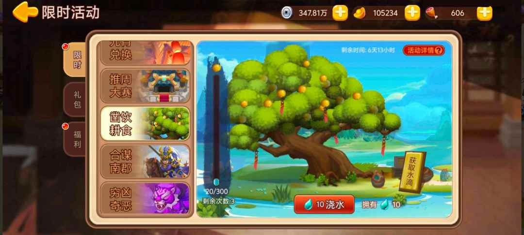 活动内容:活动期间,完成指定任务领取水滴。消耗水滴可以为宝树提供能量。填满能量条后即可领取珍贵奖励(上限3次)。