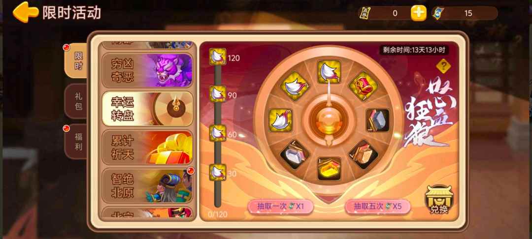 活动内容:活动期间,开启血狼套幸运转盘。 使用1个兵者符可以转1次,转盘抽得活动道具可以兑换成套装部件。完成累计转盘次数可以额外领取兑换道具。