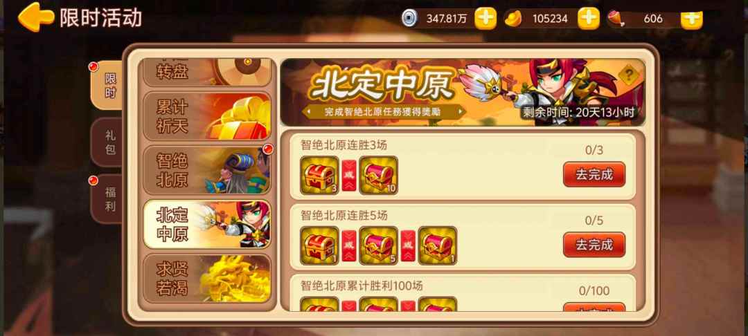 活动内容:完成智绝北原任务,领取额外奖励。连胜任务每日刷新,可多次完成。累计胜利任务仅可完成一次。