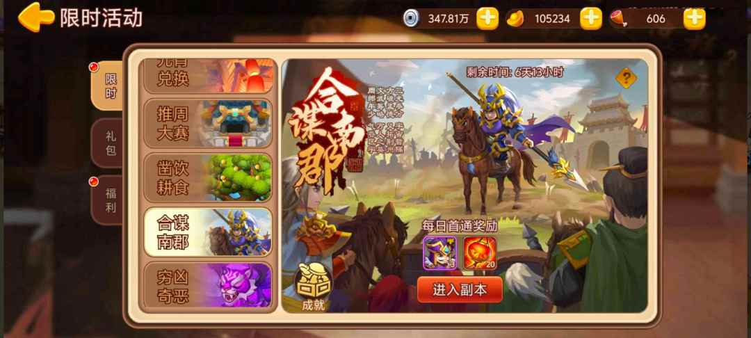 活动内容:活动期间开放“合谋南郡”限时副本,每日首通获得奖励。