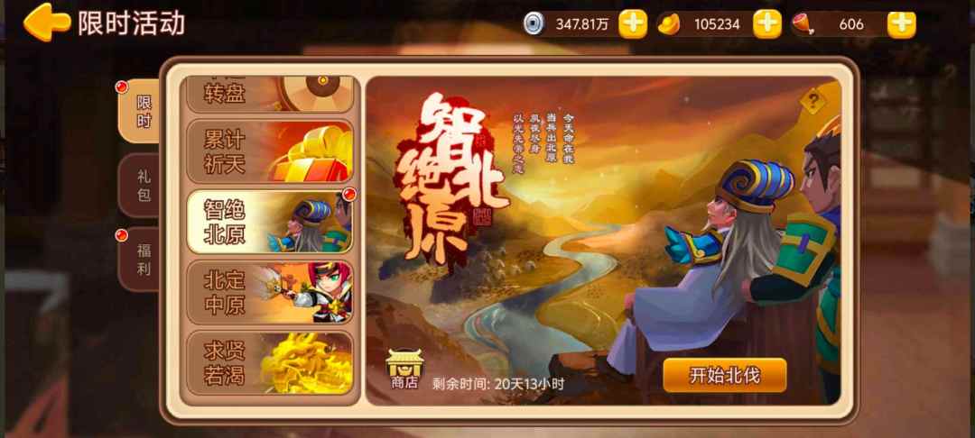活动内容:活动期间参与北伐活动,击败来袭的敌人,获取粮草可在商店兑换武将及月光套装。