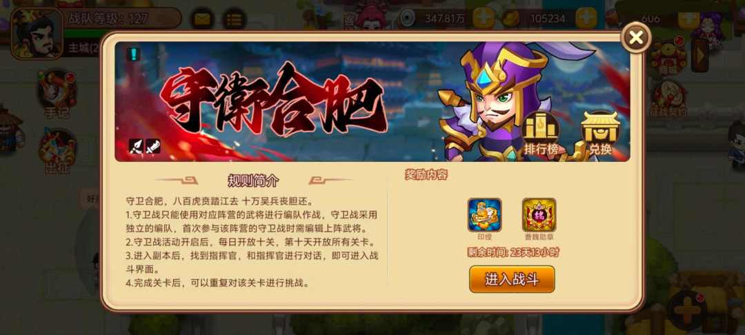 活动内容:活动期间开启魏国守卫战,挑战关卡获得印绶和勋章兑换稀有奖励。
