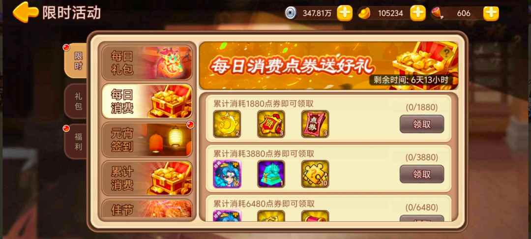 活动内容:活动期间每天累计消费至指定额度,即可领取奖励。次日0点重置消费进度和奖励。