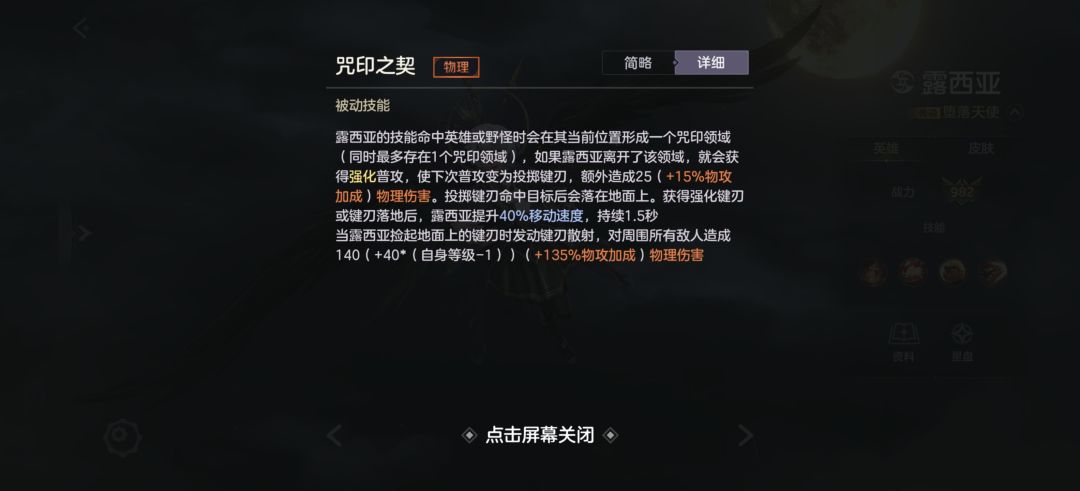 露西亚的技能命中敌方英雄或者野怪后会形成一个圆环,露西亚离开圆环范围内后获得一次强化普攻,有强化普攻时露西亚的下一次普攻改为远程,扔出咒刃造成伤害并使咒刃落在目标身边;露西亚可以捡起咒刃以对周围敌人造成伤害。在露西亚离开圆环和扔出强化普攻时,均会获得短暂的加速效果。