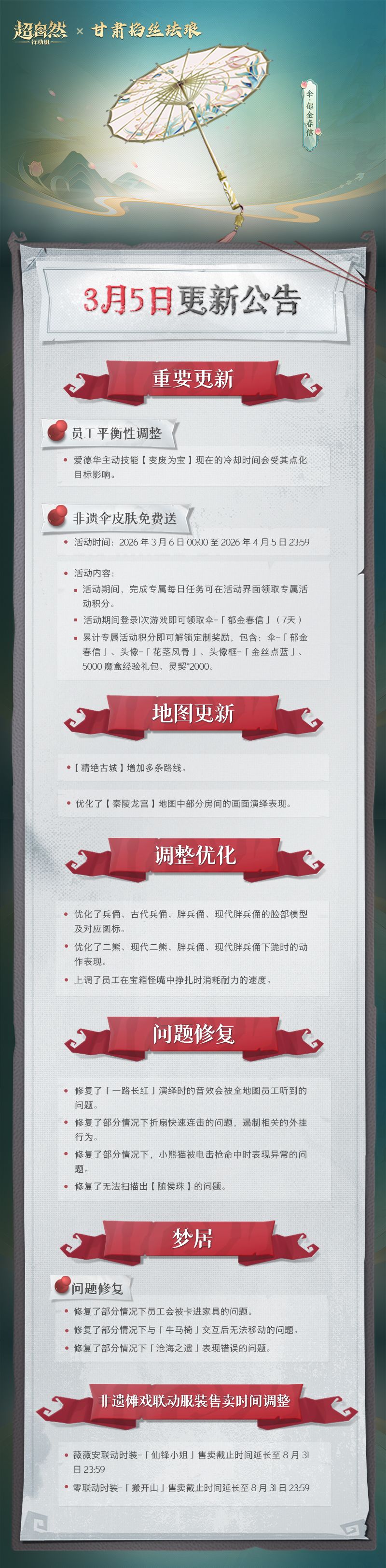 3月5日更新——非遗联动伞皮肤登录免费送!爱德华技能加强上线!
