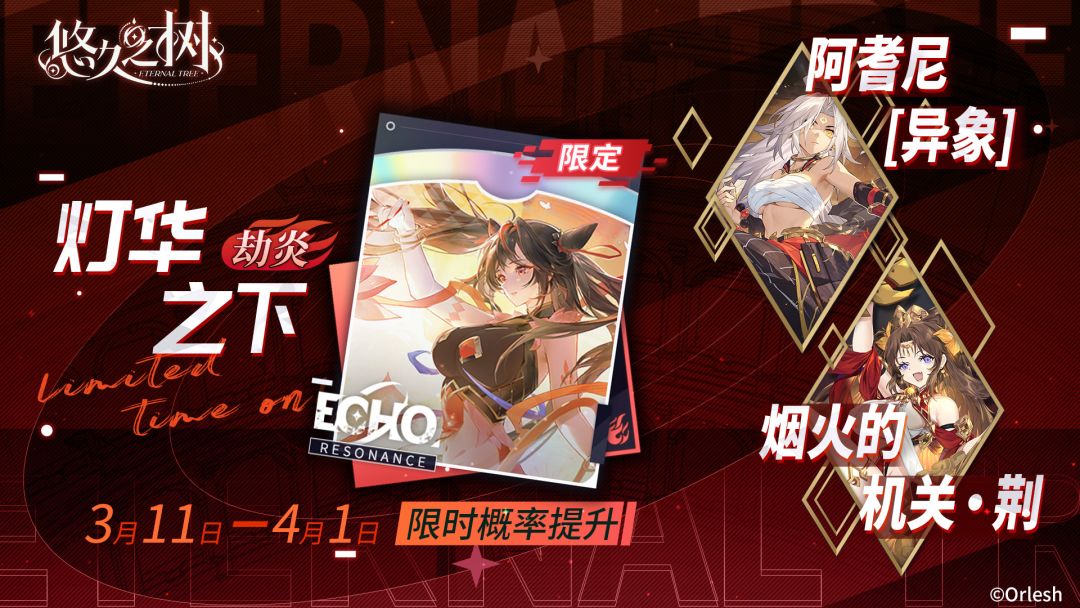 活动期间,新回响&虚数体UP许愿池限时开放,全新火属性堕天福音系列回响「劫炎·灯华之下」、全新火属性幻象誓约·异象系列虚数体阿耆尼[异象]、全新火属性蓬莱机偶系列虚数体烟火的机关·荆加入许愿池,且在本许愿池内的凝聚概率大幅提升!