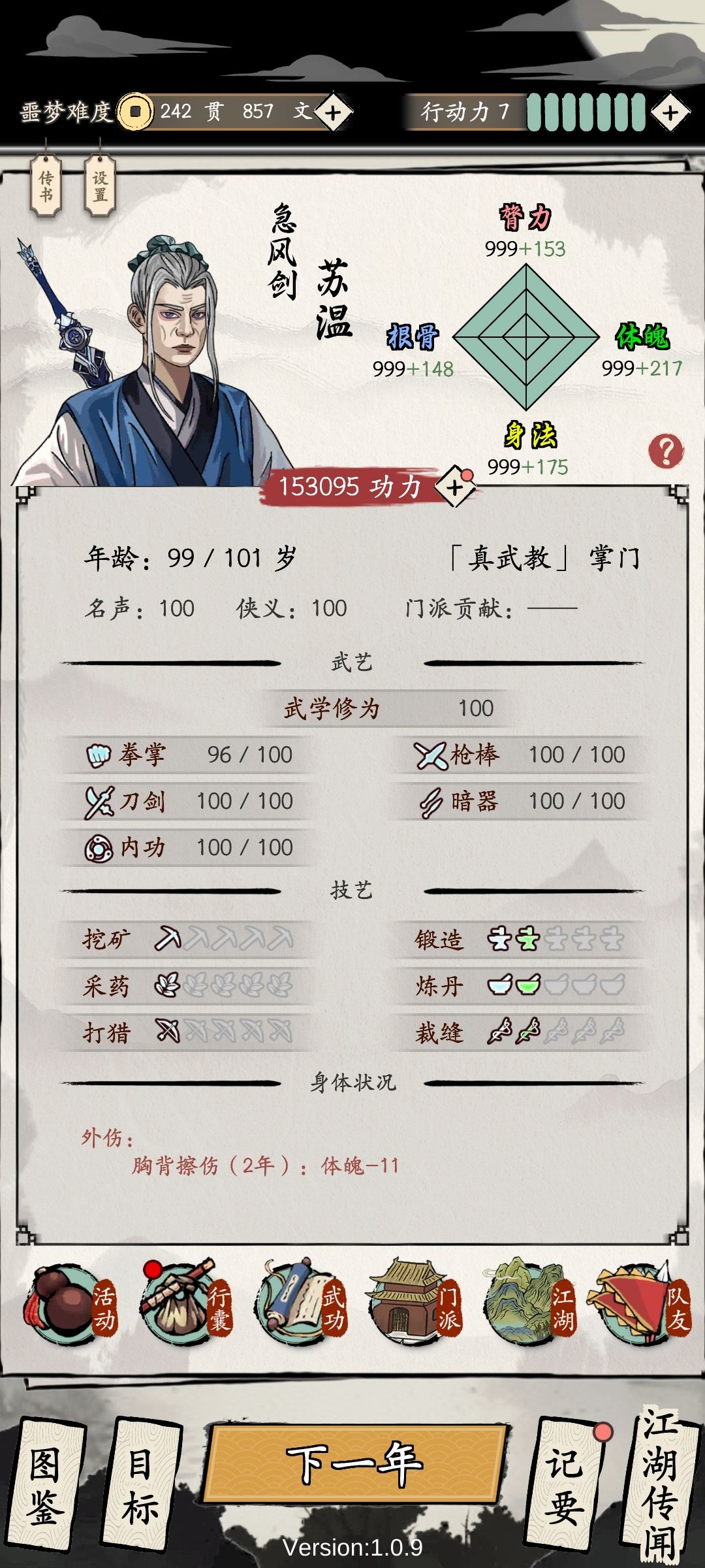 十武,噩梦,最后二十年都没发展门派直接快进的,不然发展发展门派功力能再高一点。发帖纪念游戏结束,累了卸载了