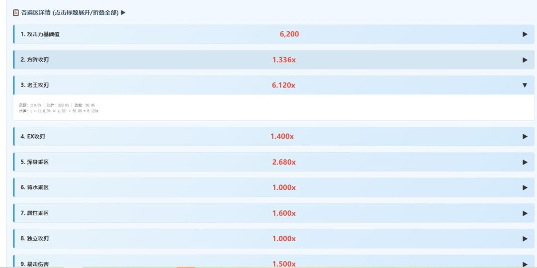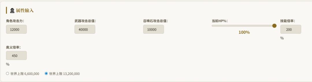 6. 输入角色攻击白值/ 武器白值总和/ 召唤石白值总和/ 现在HP百份比/ 技能倍率/ 奧义倍率/ 世界上限