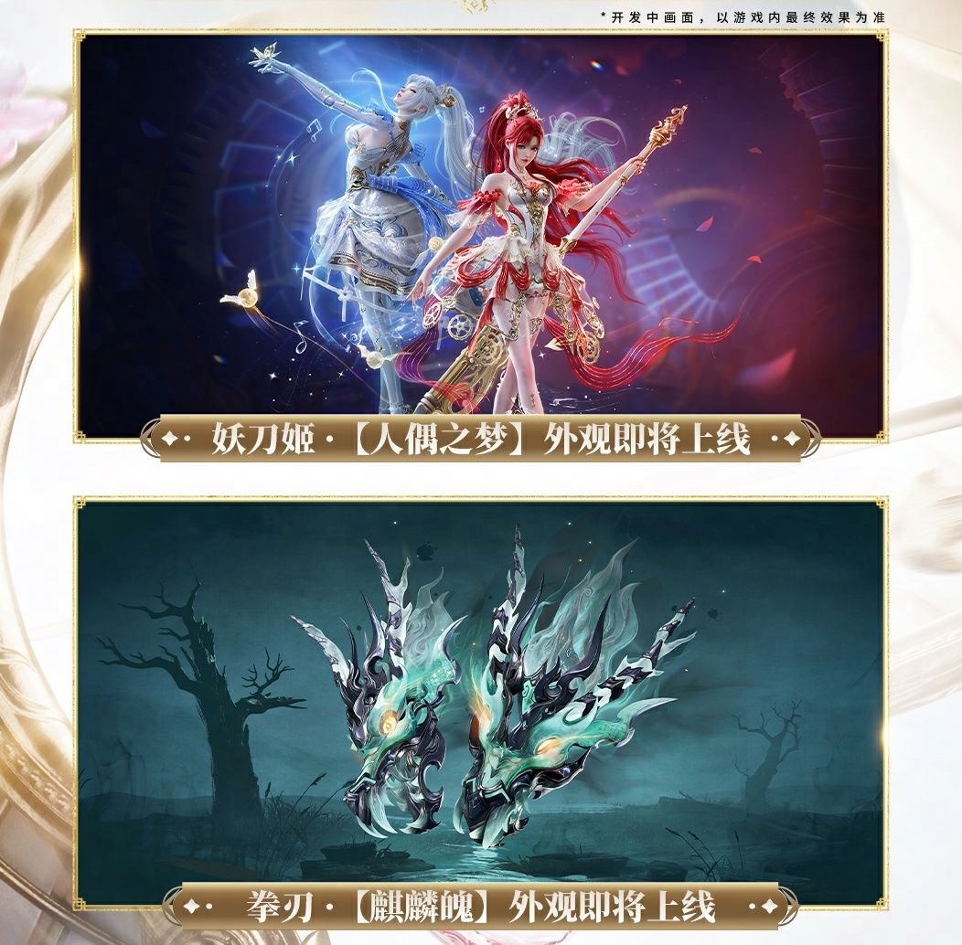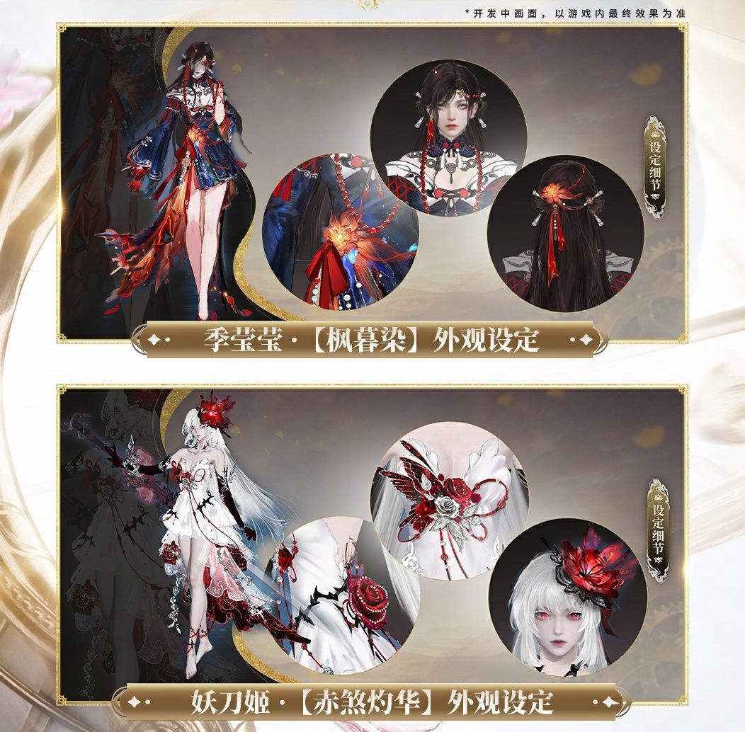 季莹莹和妖刀姬也将迎来全新华丽焕新时装,季莹莹一袭枫红染衣,妖刀姬白裙如霜下赤煞显现,最终时装效果敬请期待~