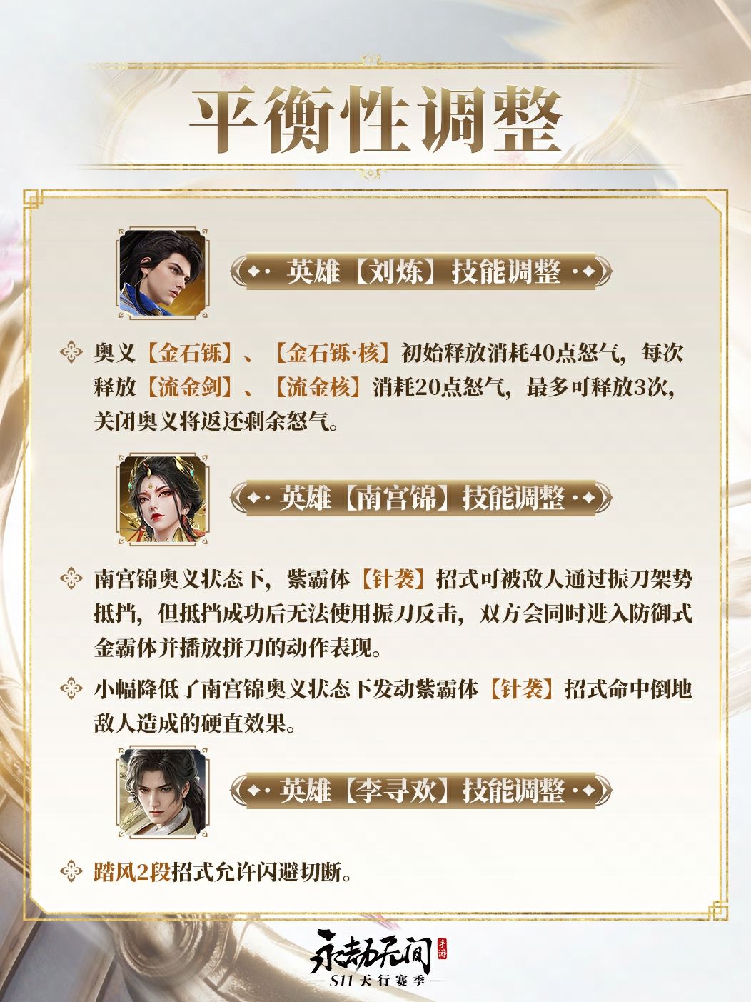 S11赛季部分英雄也将迎来调整,综合后台数据与玩家反馈,我们将对刘炼、南宫锦、李寻欢做出如下平衡性调整——