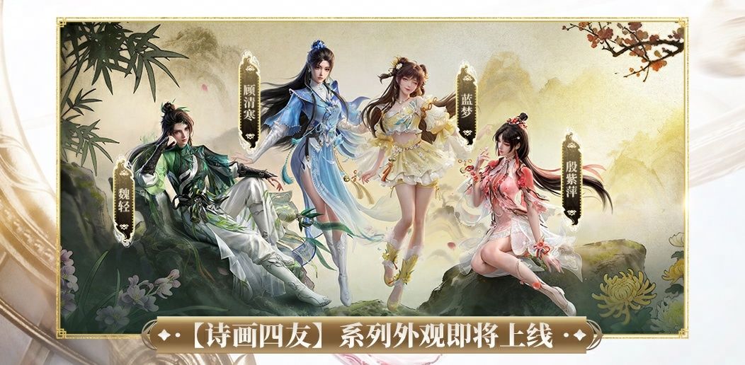 以传统文化中借物喻志的经典意象,花中四君子——梅、兰、竹、菊为灵感来源,【诗画四友】系列外观即将上线,魏轻、顾清寒、蓝梦、殷紫萍化身四友,共绘武侠诗画。