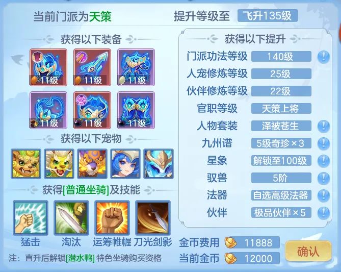 1)新创建的角色在小于60级时可花费金币使用等级直升服务,可将角色等级提升至飞升135级,同时配备全套装备、宠物、法器、技能、官职和修炼养成,助力日常无忧;2)服务器开放天数达到一定条件后可开启,本周新增天下无双、江山如画、惊韬海浪、神来气旺、游云惊龙、阳春白雪、飞花逐月、万木争春、今年勇、叱咤风云、二〇二〇、志气冲天、生日快乐开放,其余暂不开放。