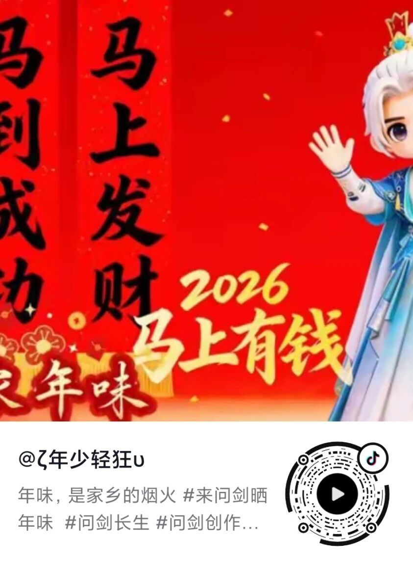 (2)视频开头需要携带“我在xxx(地方名),我来给各位道友看看我家的年味…”满足以上两条才算成功参与奖励评选,活动最终根据点赞量排序开奖。