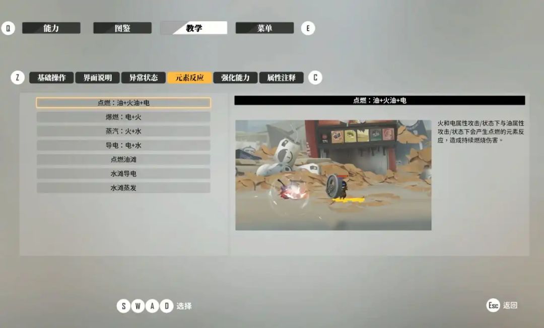 游戏还有许多有趣的机制,比如超长滞空平a、超猛重击、头锤顶球等等,并且还支持上调和下劈,机动性这一块直接拉满。当然,要论最有趣的机制还得是“元素反应”,游戏一共有火、油、水、电四种元素,不同元素之间可以相互反应,比如油+火油+电会触发点燃效果,电与水会触发导电效果,即使是地上的水滩、油滩,都能发生反应,当面临强大或者成群的敌人时,就可以考虑利用这种方式击溃敌人,趣味性拉满。