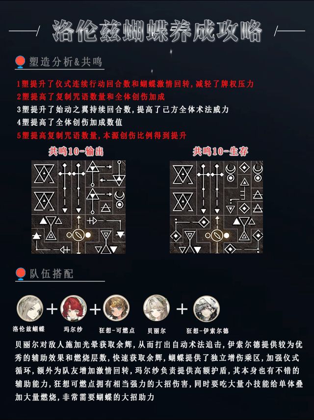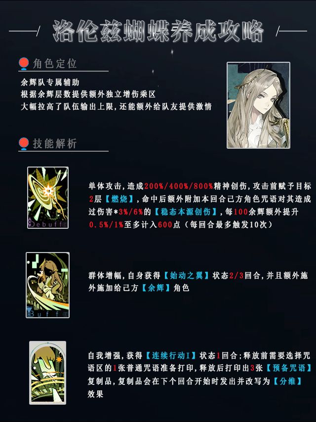 蝴蝶是余辉队专辅,还能提供激情回转,增加全体创伤加成和术法威力,大招复制小技能