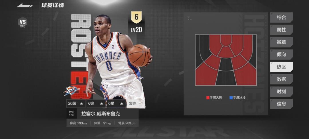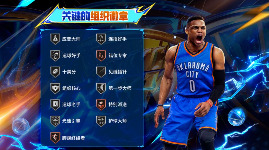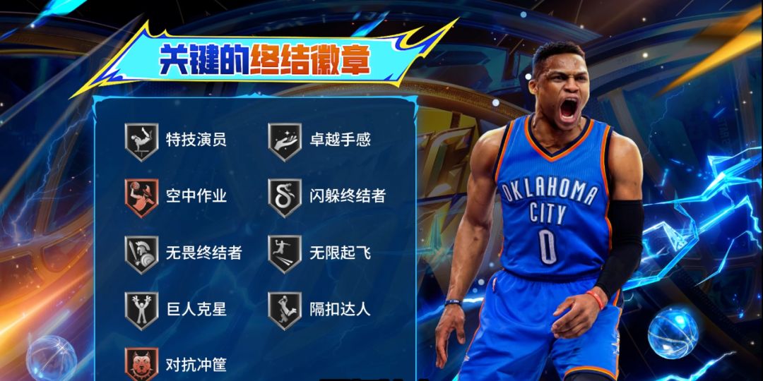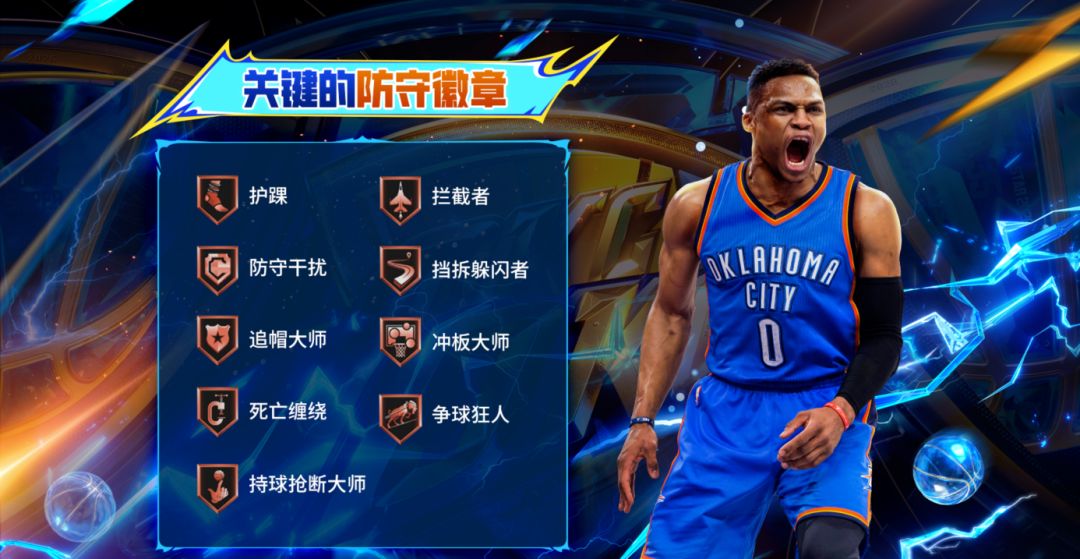 街头模式担任1号位的威少,同样有顶级的单打突破能力,速度和突破属性极高,外加铜对抗冲框等终结徽章,完美适配威少的打法。