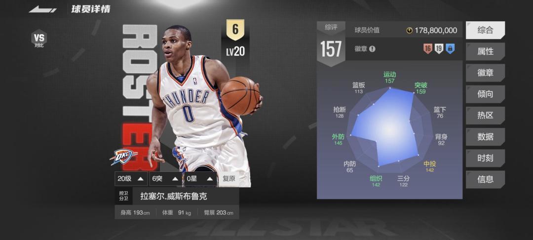 雷霆威少正式登陆美职篮全明星!157的综评,搭配19银16铜的徽章,上了场直接五档起步,威力全开。老K表示,熟悉的青春风暴席卷而来!