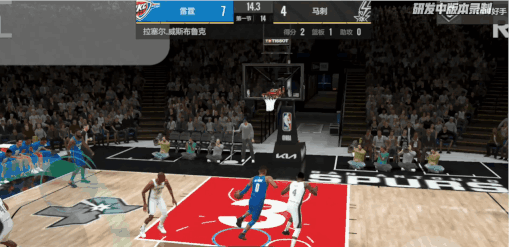 游戏中的雷霆威少拥有顶级的突破终结能力:162的突破上篮和157的突破灌篮,搭配银无畏终结者、隔扣达人、巨人克星、特技演员、对抗冲框等终结徽章,能高效地冲框得分