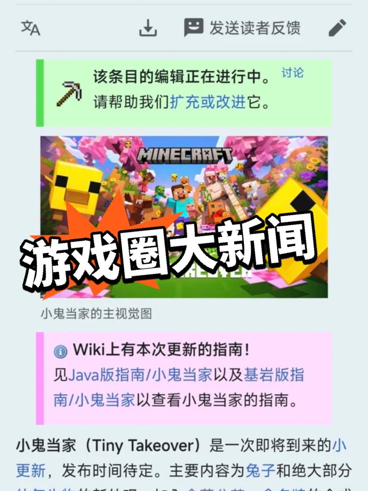 大的来了家人们!近日 我的世界2026年第一次更新名称正式公布了,英文为Tiny Takeover,官方确定中文译名叫小鬼当家,很快在社区引发热议。