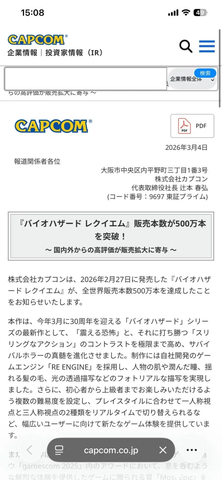 原因和这款游戏最近公布的销量有关,最近,卡普空官宣生化危机9销量突破500万份,据公开信息显示,此次PC版的销量占了总销量整整一半,创下了系列新高。