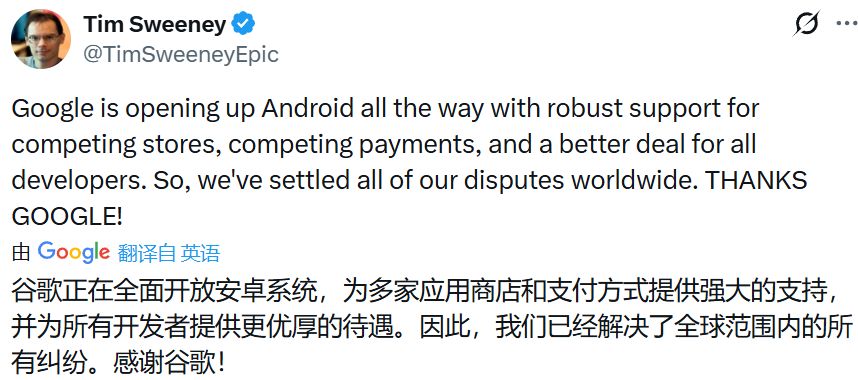 Epic Games那边看起来大抵也是挺满意了。公司CEO Tim Sweeney在X上发布了《堡垒之夜》将回归Google Play的好消息,之后还发帖感谢了Google对安卓生态、开发者的支持。