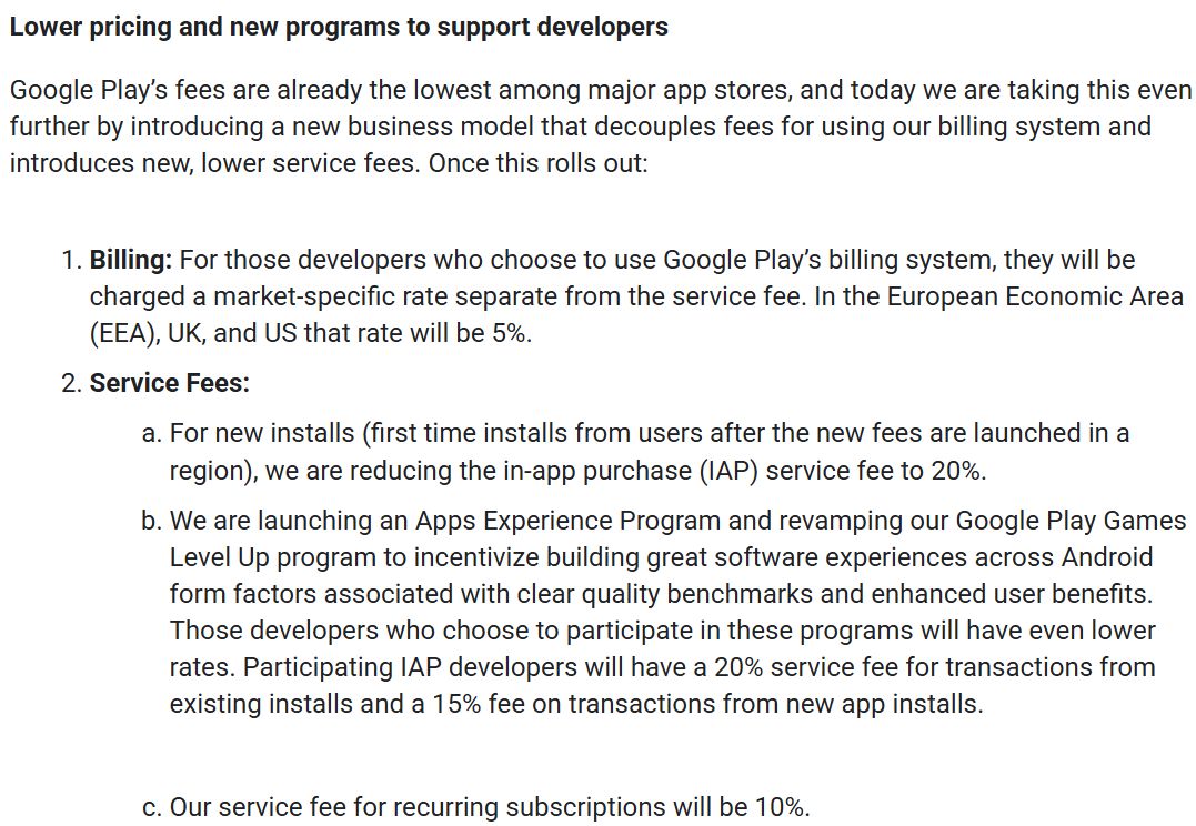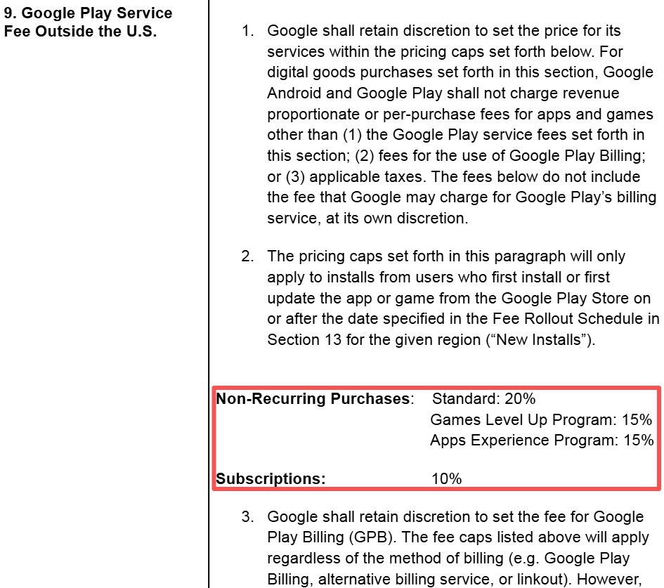 Google同意将其在Google Play商店的抽成比例下调至20%。订阅服务的抽成降至10%。参与游戏升级计划(Games Level Up Program)、应用体验计划(Apps Experience Program)的软件,其新安装用户的抽成比例为15%。