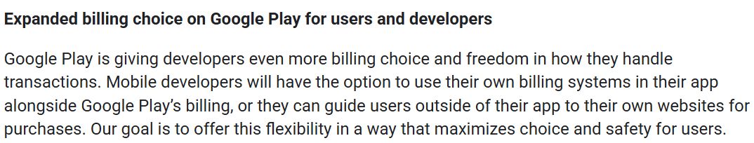 Google允许开发者在App内提供自己的支付系统,不再强制大家使用Google的结算通道。