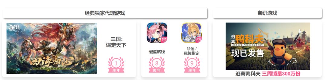 财报将去年游戏业务营收增长,归因于《三国:谋定天下》的带动,和自研产品《逃离鸭科夫》的上线;同时,公司代理的《命运/冠位指定》《碧蓝航线》等长青游戏保持了相对稳健的收入表现。